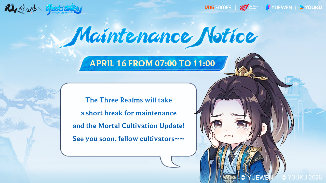 The Ghost Story: Love Destiny Operations Team would like to announce full server maintenance from 07:00 to 11:00 on April 16, 2026 to officially update the New Version — Mortal Cultivation.