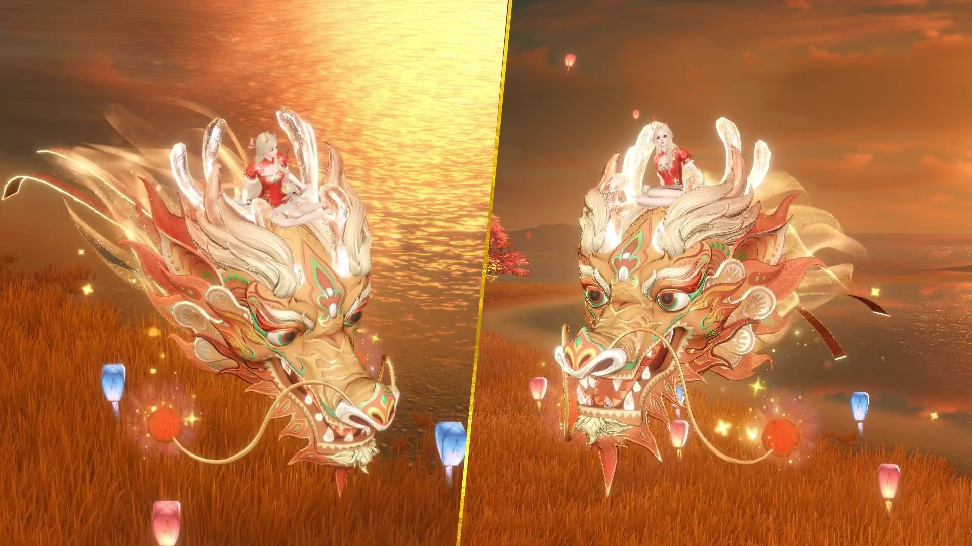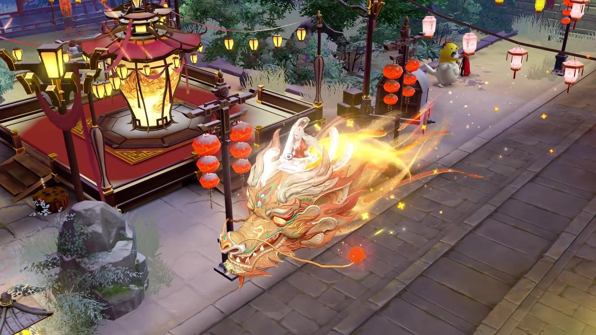 手工艺人在制作时,会在龙体内装上蜡烛,夜间舞动时布龙通体发光,活灵活现。倩女幽魂手游也将这一特点保留在了坐骑中,并让它在科技的帮助下变得更加华丽。