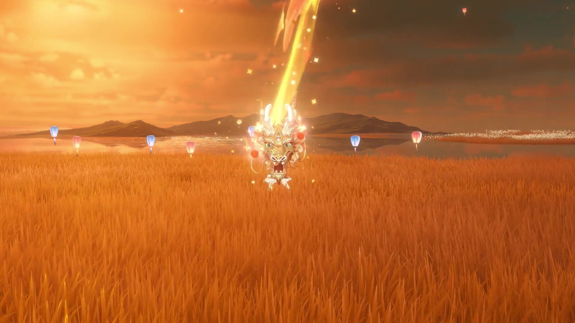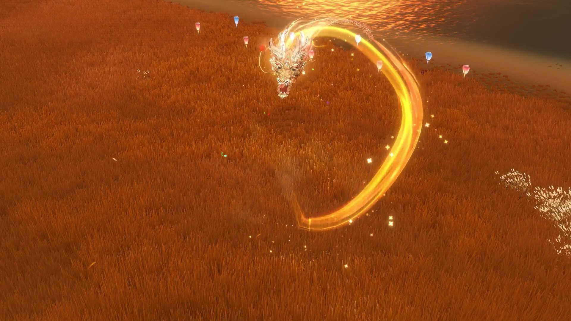 龙头金光闪烁,喜庆气息迎面扑来,尾部火焰翻卷,飞行途中星光洒落,华丽非常。