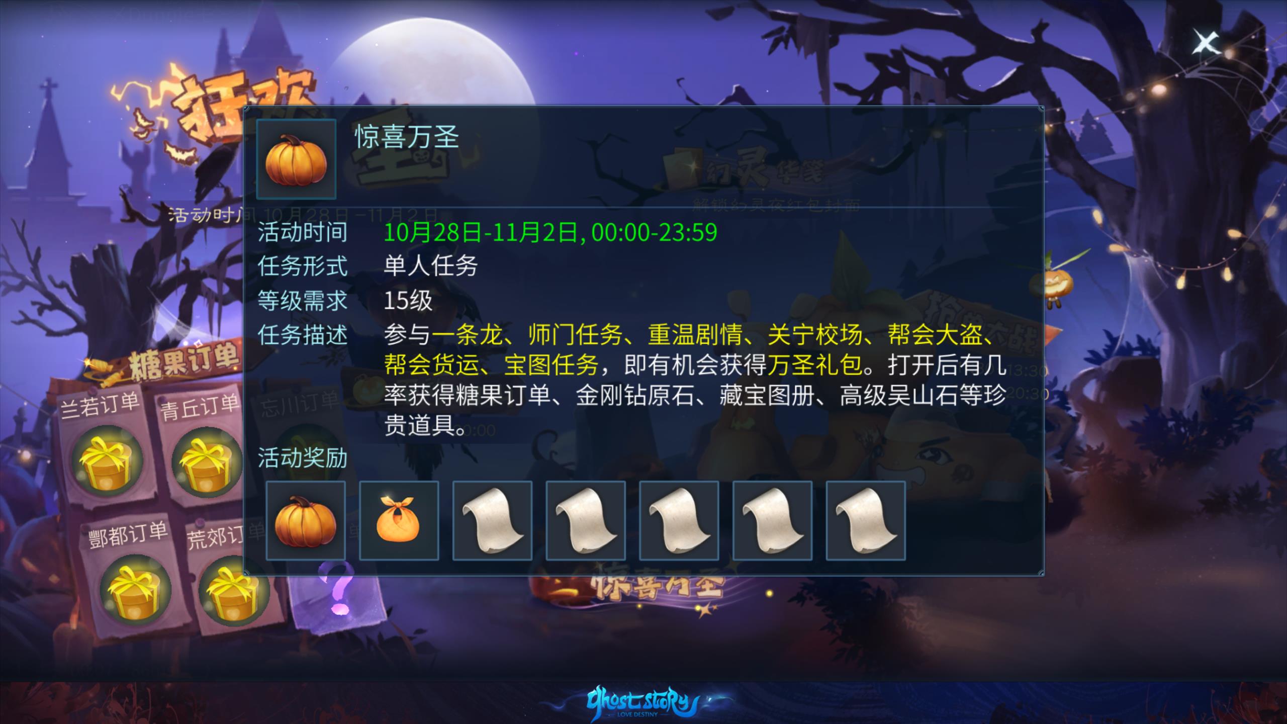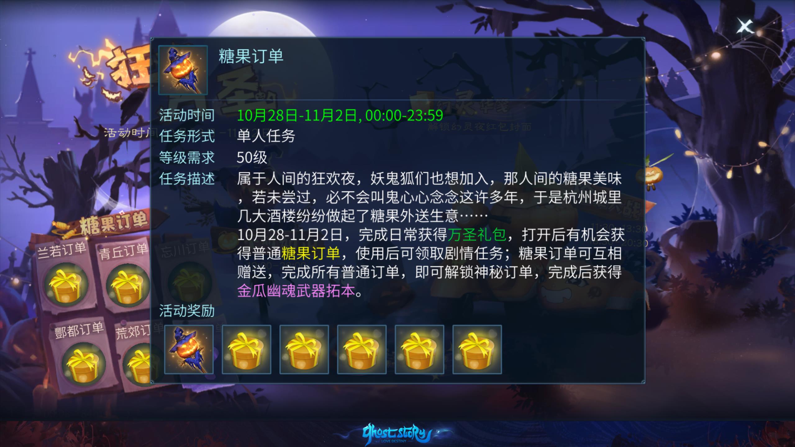 - 接取任务:[万圣节]万圣将至,完成任务后将触发任务:[万圣节]兰若寻人。玩家可使用获得的糖果订单完成任务。共有五种糖果订单令:兰若订单、青丘订单、忘川订单、酆都订单和荒郊订单。完成全部五种普通订单,玩家将获得神秘订单。