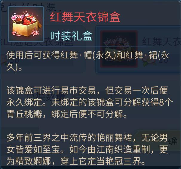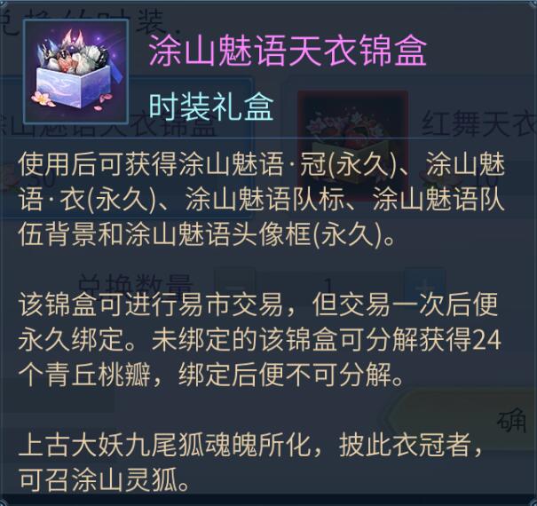 青丘宝鉴活动期间,可消耗青丘桃瓣兑换涂山魅语天衣锦盒和红舞天衣锦盒。青丘桃瓣可于青丘宝鉴中获得,也可由分解指定外观获得。详细规则请见“兑换”-“兑换天衣锦盒规则介绍”。青丘宝鉴中获得的天衣锦盒和兑换获得的天衣锦盒均为2024年9月12日12点0分后才会解除交易保护。