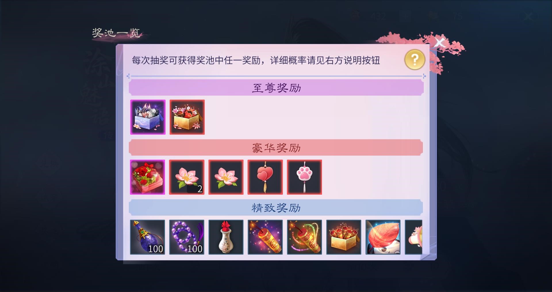 精致奖励:出现概率为82.74%,包含净瓶*100(9.5%)、念珠*100(9.5%)、小云笈丸(9.5%)、繁星如雨·烟花筒(4.7%)、莲散千烛·烟花筒(4.7%)、火树银花·盲盒烟花筒(4.7%)、易容红叶(2.34%)、凝音海棠喇叭(4.7%)、玫瑰问情(4.7%)、星辰为鉴(4.7%)、红包(9.5%)、绚丽玫瑰(4.7%)、玫瑰(9.5%)。