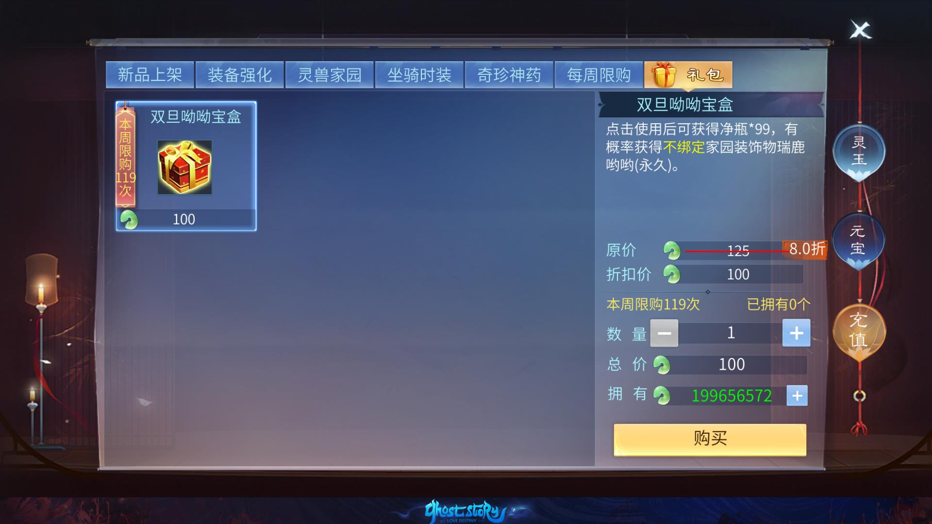 - 在活动期间,幸运礼包将可以在: 商场 => 灵宝 => 礼包标签处购买。