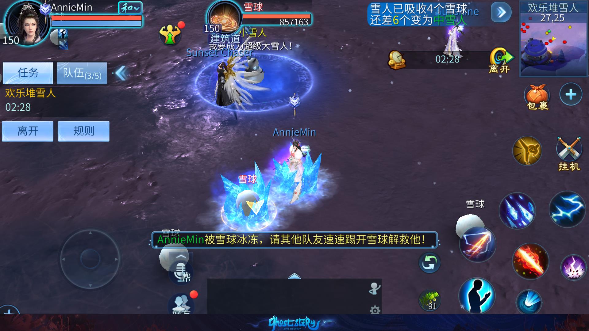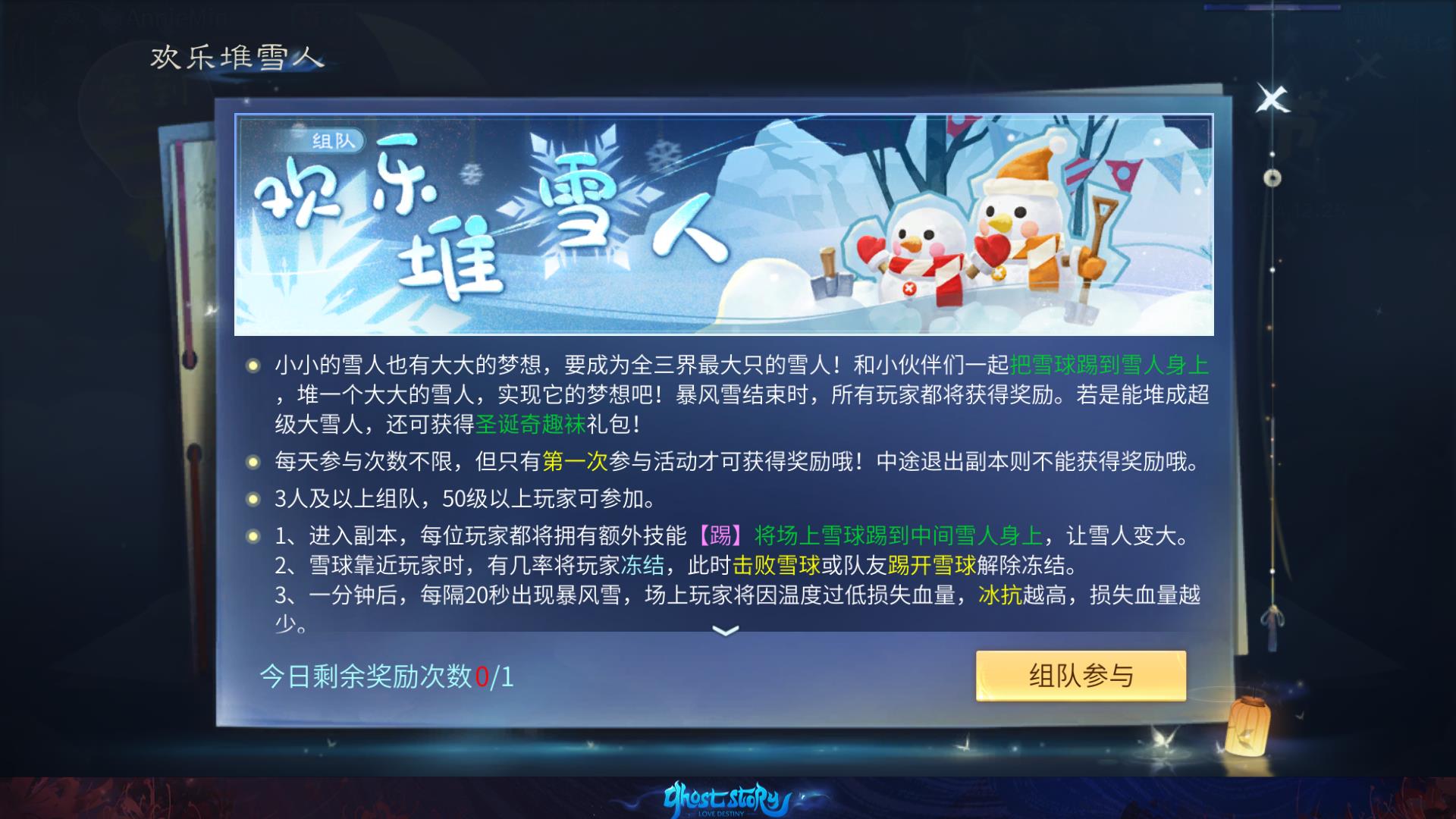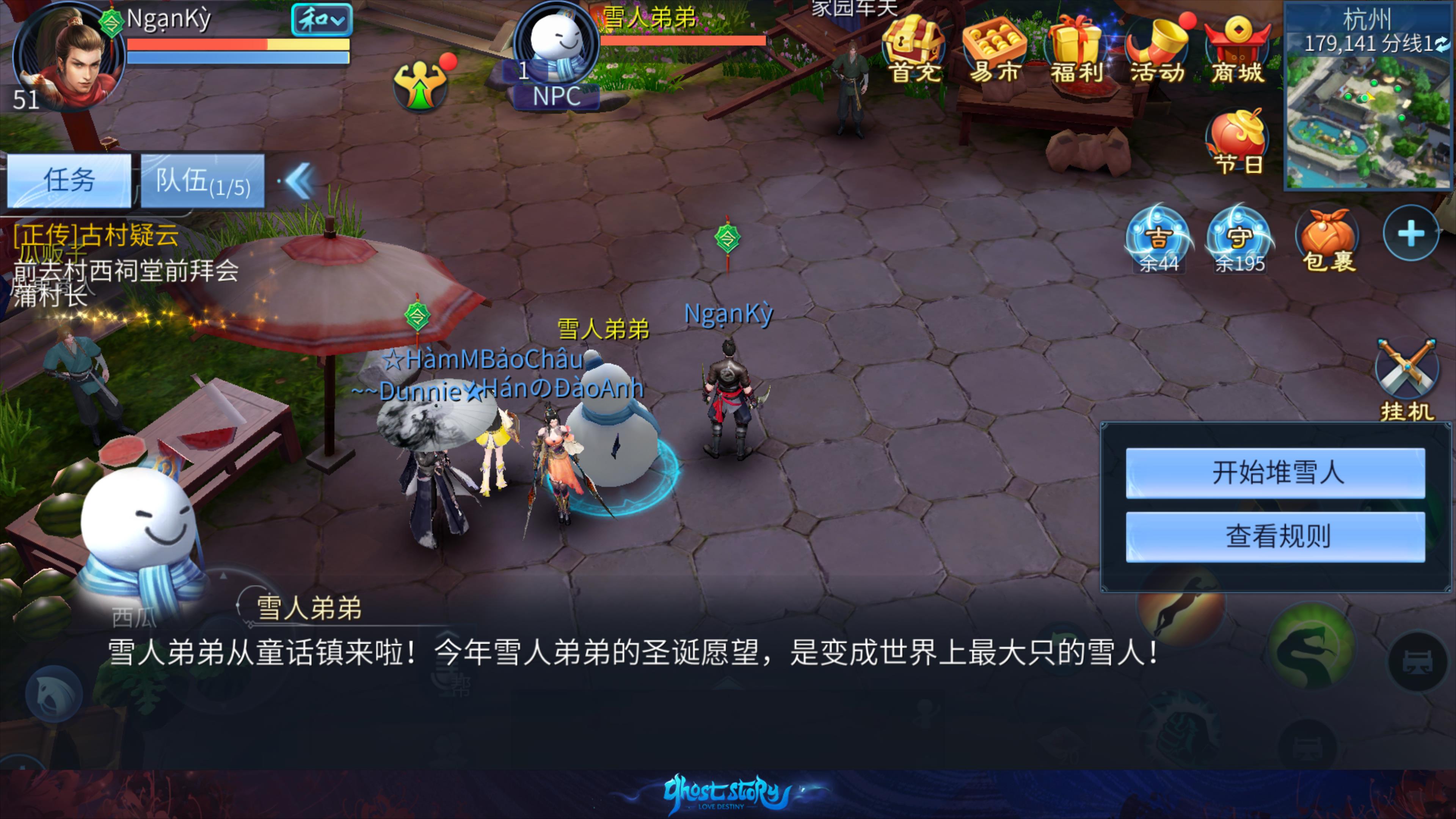 - 3人或以上组队前往杭州(179,139),找到雪人弟弟,参与堆雪人活动。