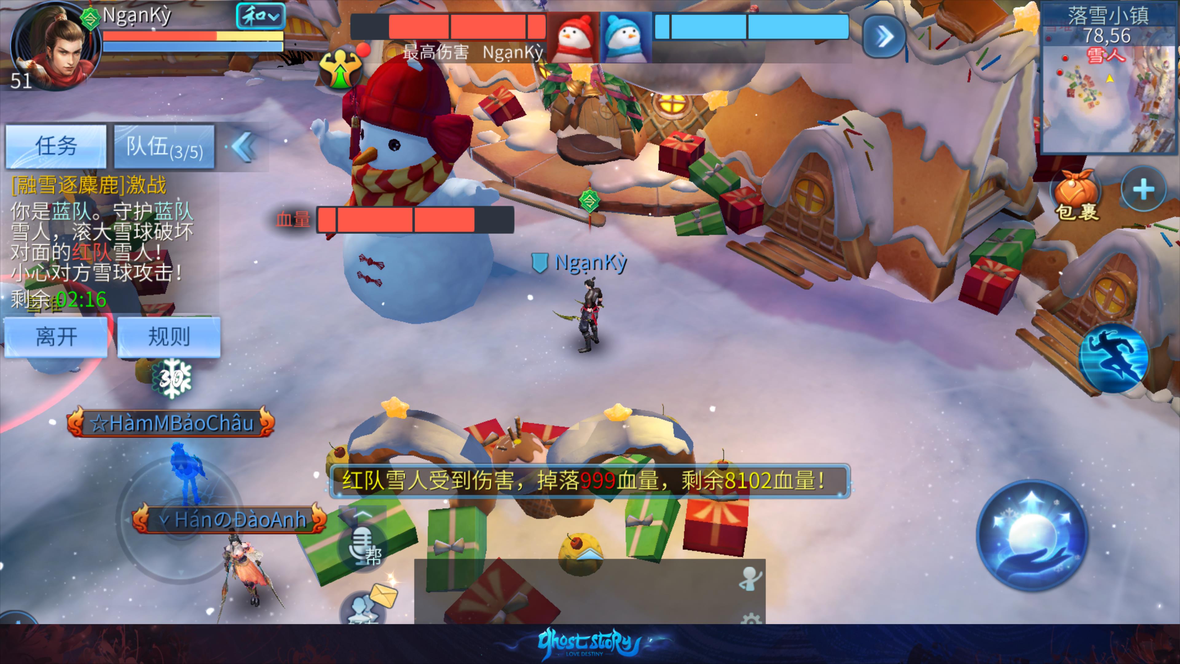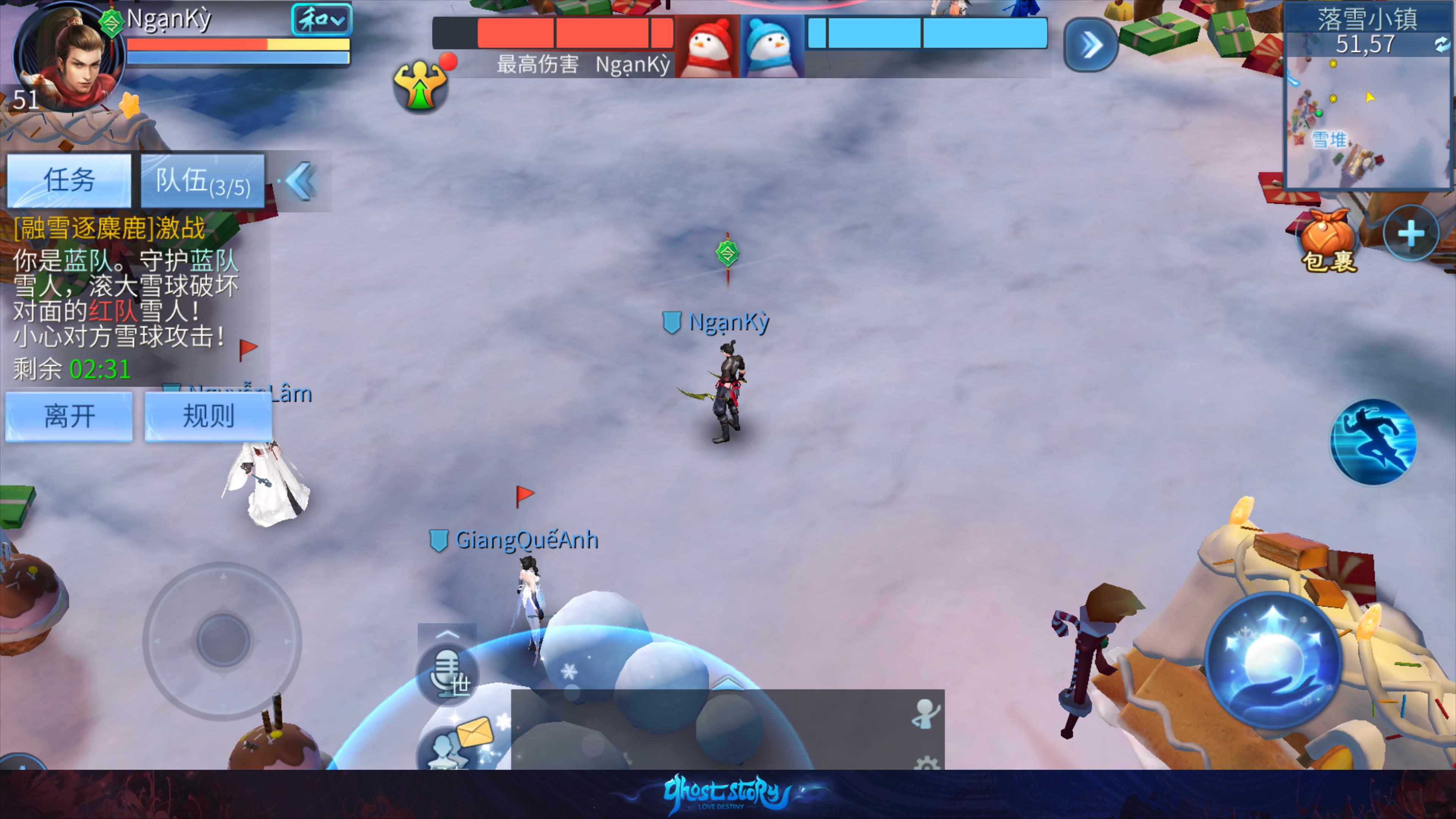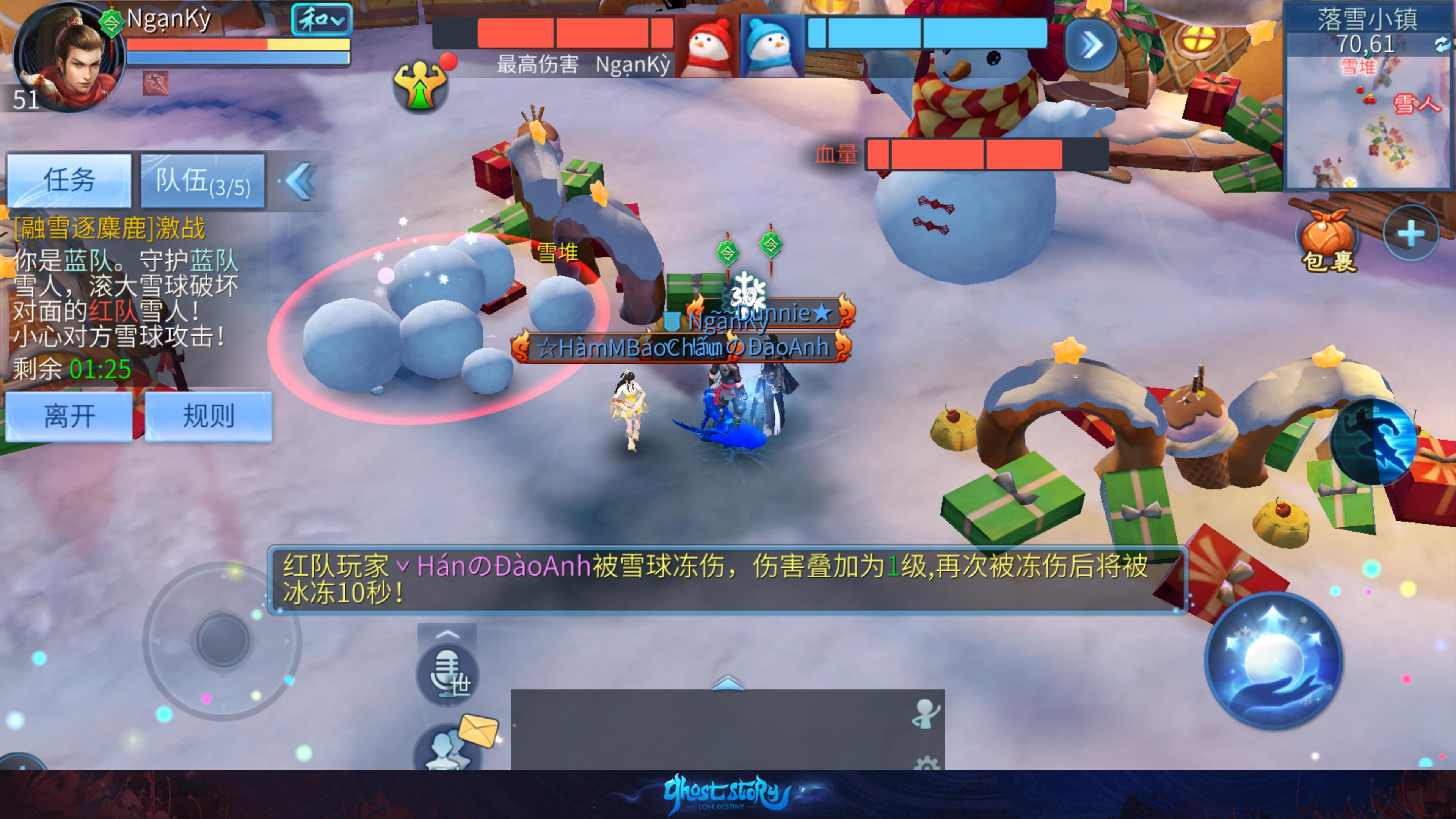 - 蓝队与红队需要击败对方队伍的雪人以获得胜利。
