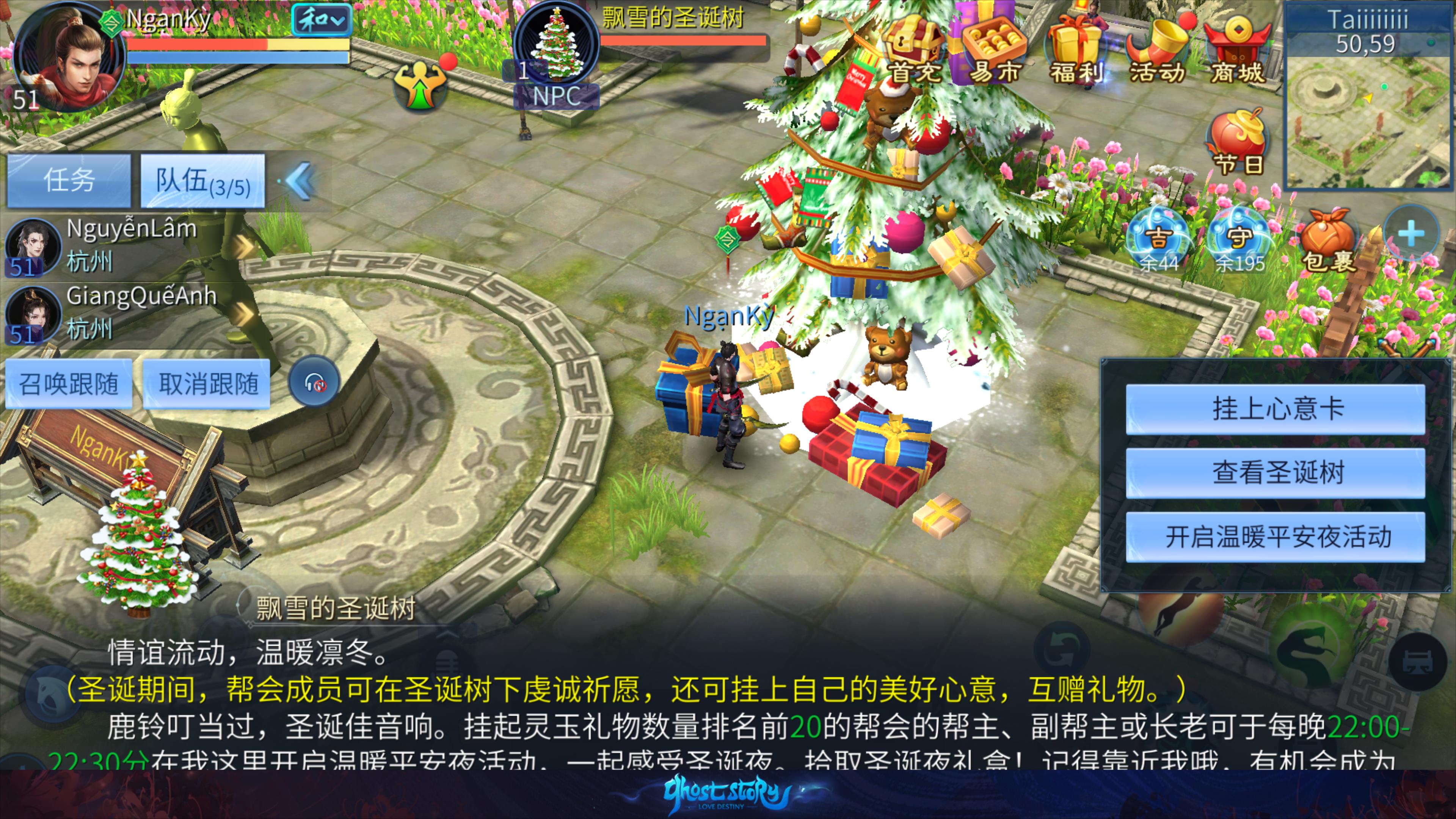 - 帮会内将出现一棵覆盖雪花的圣诞树,成员可以在上面挂上愿望卡并互换礼物。