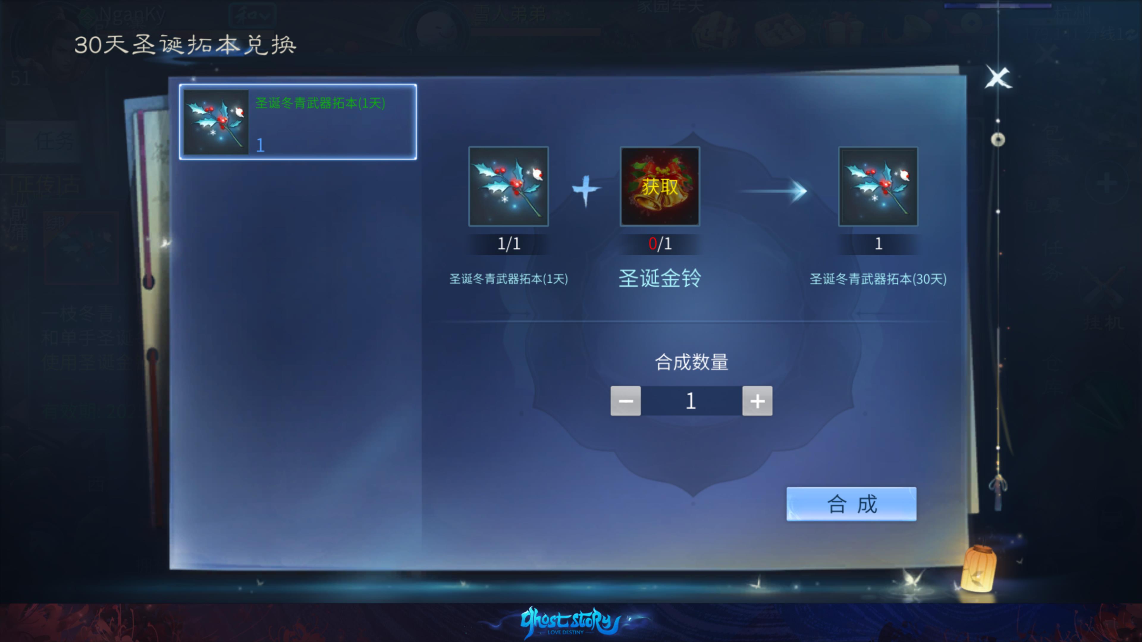- 使用圣诞铃铛道具,可合成1天或3天的圣诞冬青武器拓本或圣诞蜜糖武器拓本,将外观时效延长至30天,同时附加绚丽特效。