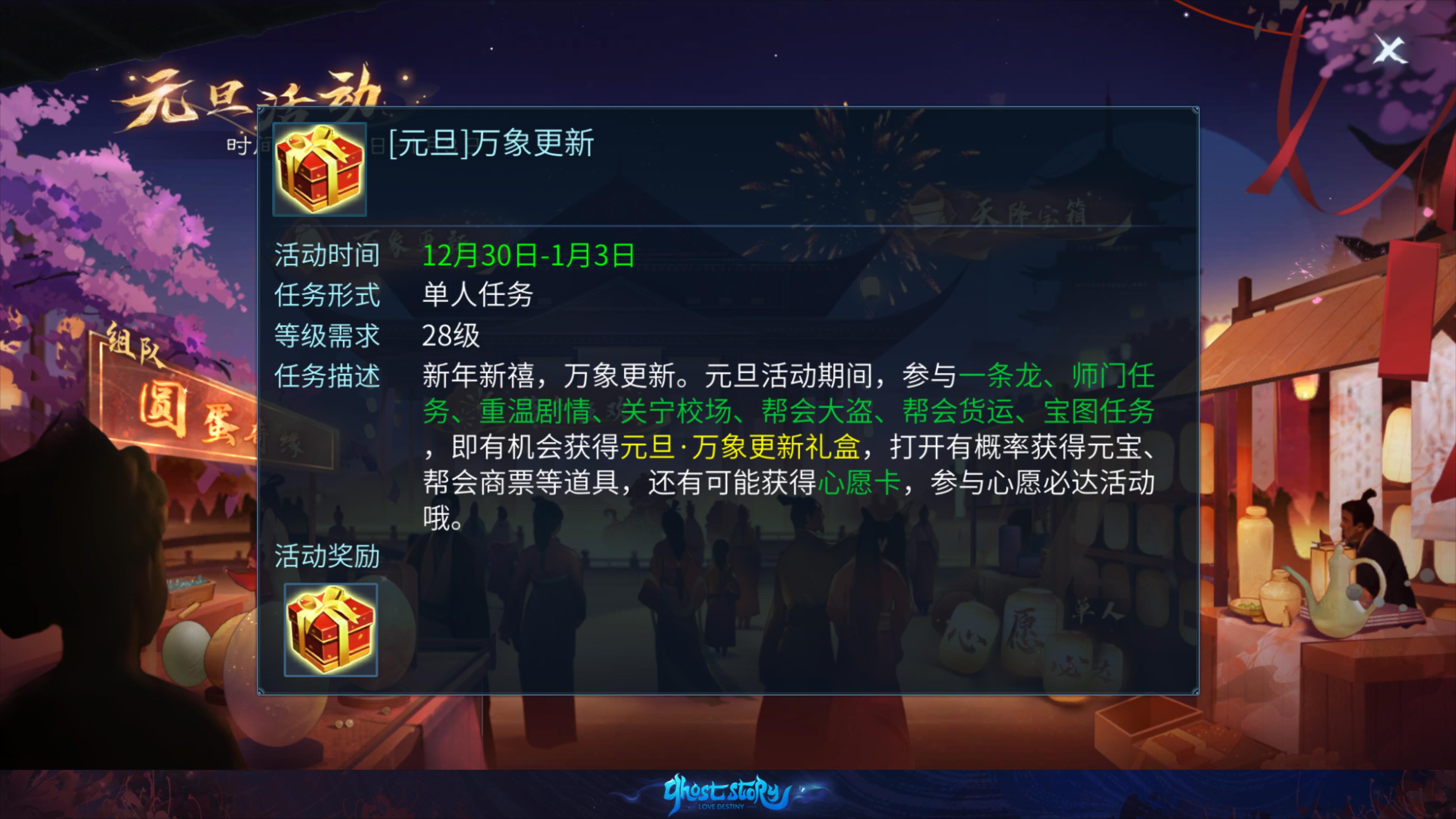 - 你有机会获得元旦·万象更新礼盒,开启后可能会获得元宝、帮会商票等物品,甚至有机会获得心愿卡 ,参与心愿必达活动。