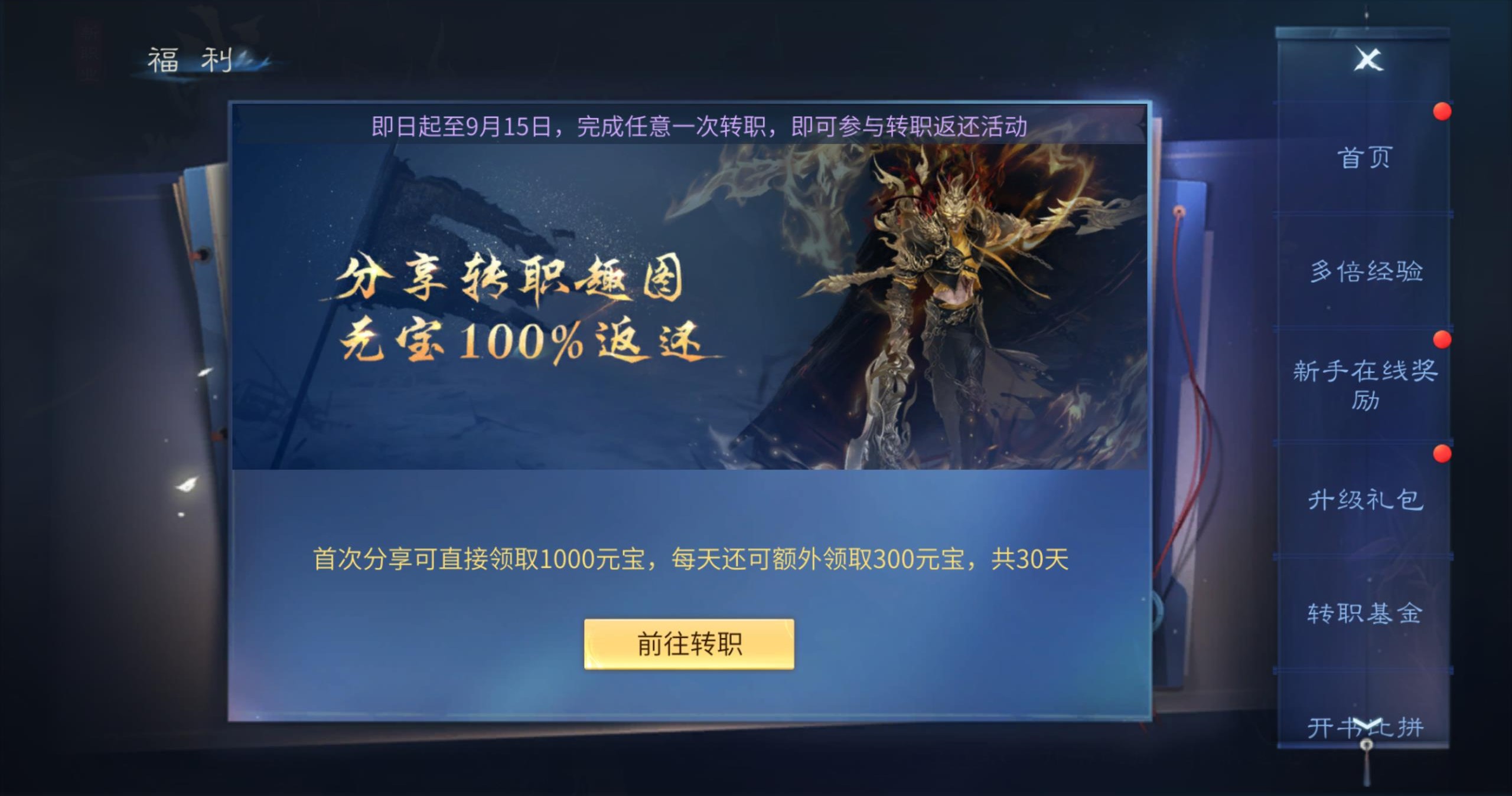 - 活动期间,完成任何转职即可在福利界面 => 转职返还中领取高达 10,000 元宝。分享你第一次转职的截图,即可立即获得 1,000 元宝。