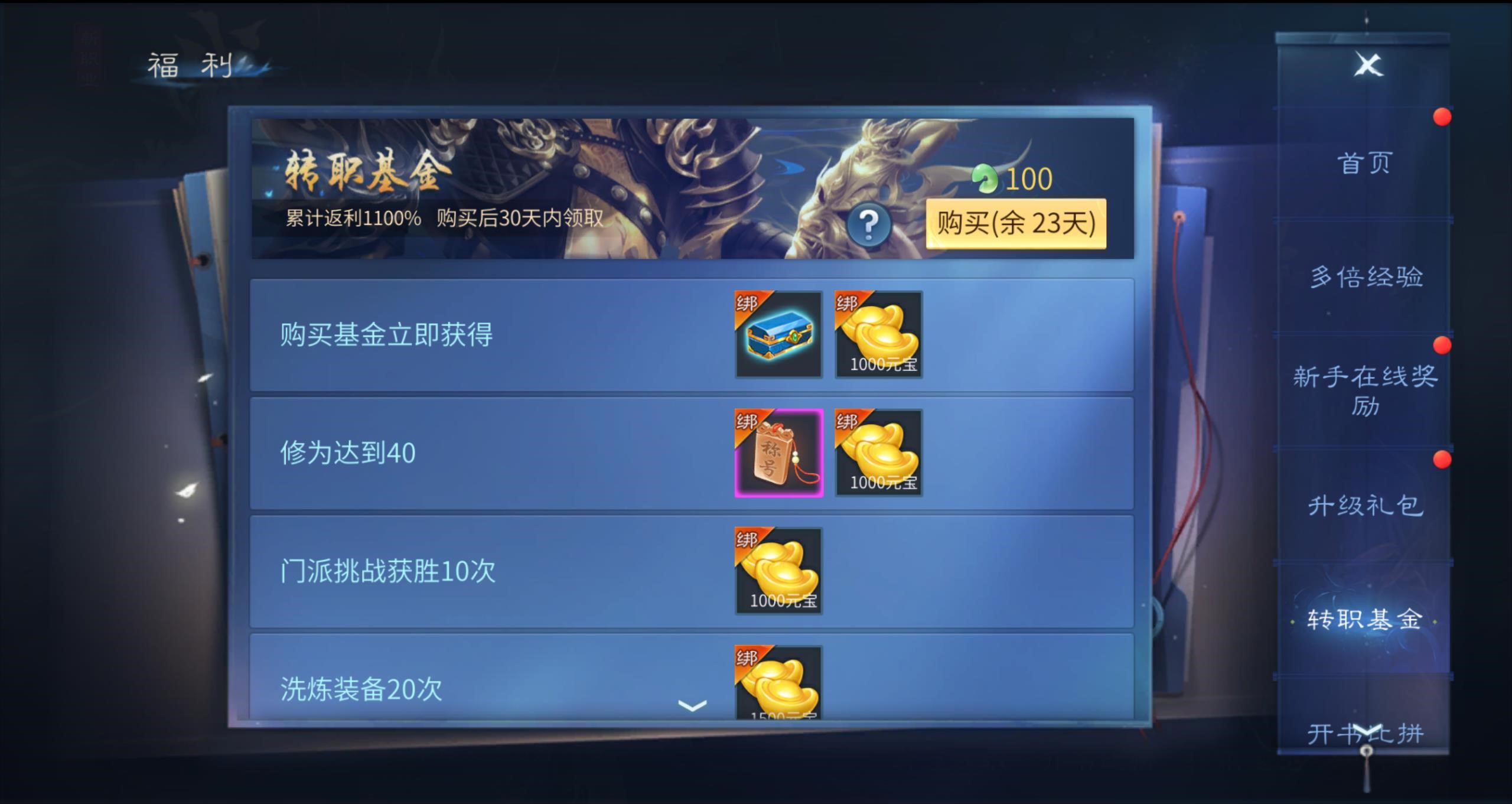 - 活动期间,完成任何转职并购买转职基金,完成任务后可在30天内获得奖励。最高可获得 1100% 的退款。转职活动结束后,购买的转职基金直到购买后 30 天后仍可在福利界面 => 转职基金中继续完成任务并领取奖励。