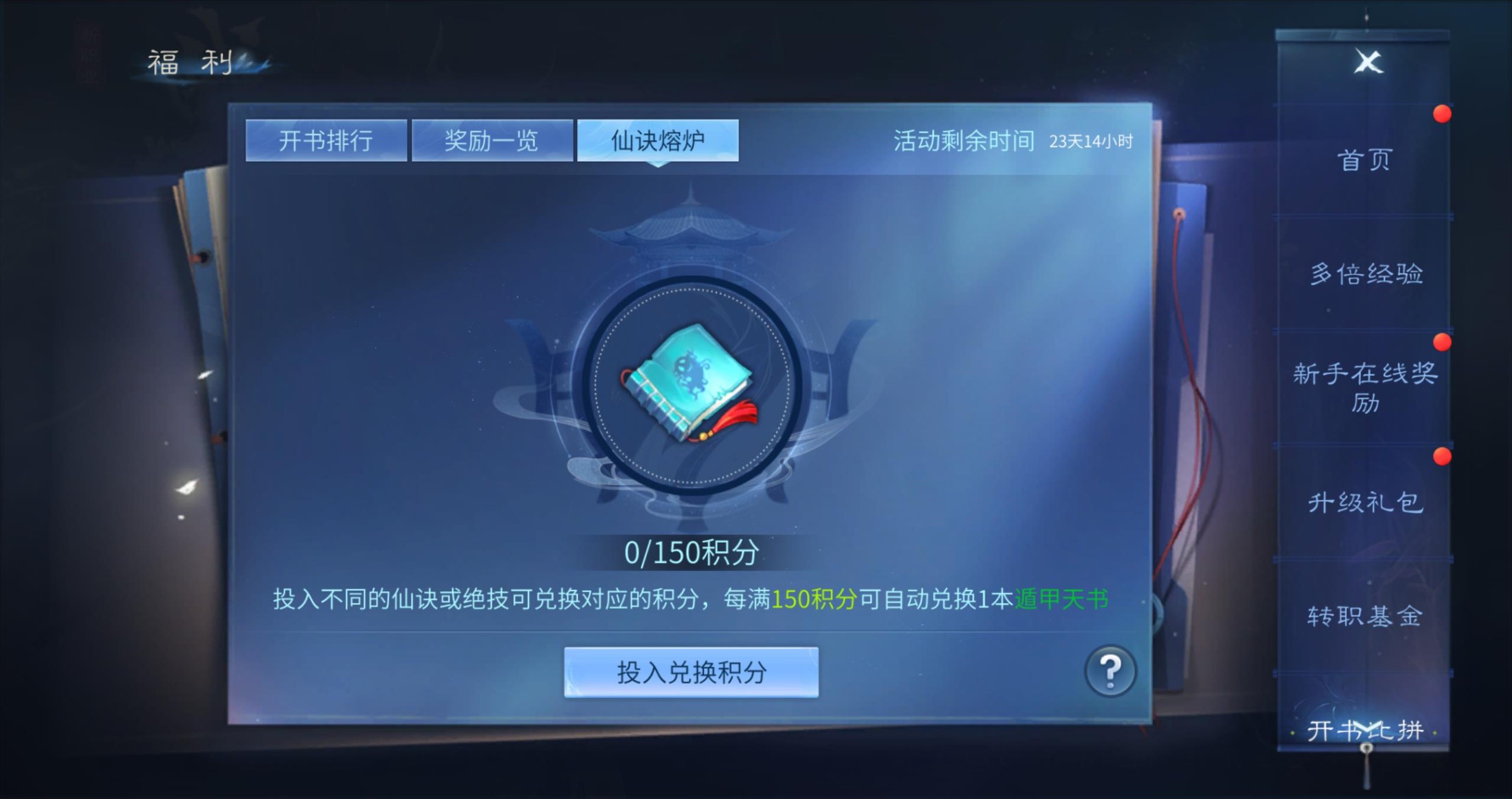 - 您可以通过兑换技能书或绝技来获得积分。累计150积分即可兑换1本遁甲天书。