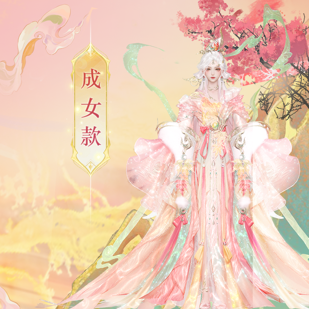 【春山云华】——成年女角色:异色圣女,高级粉色裙裳,搭配“落霞云归”之舞与神力光辉,尽显上神风采。