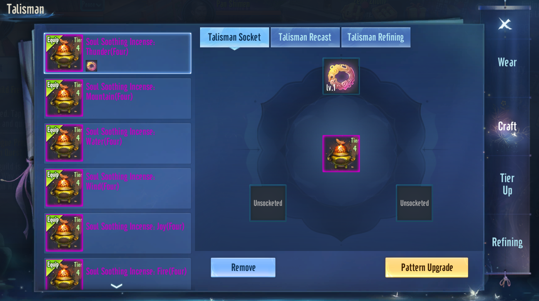 - Upgrade Immortal Talisman Grade: When the Immortal Talisman proceeds with a grade upgrade, the Pattern in the Talisman does not need to be removed and can still be operated directly. After completion, the Pattern remains in the new Talisman, and the number of sockets does not change.