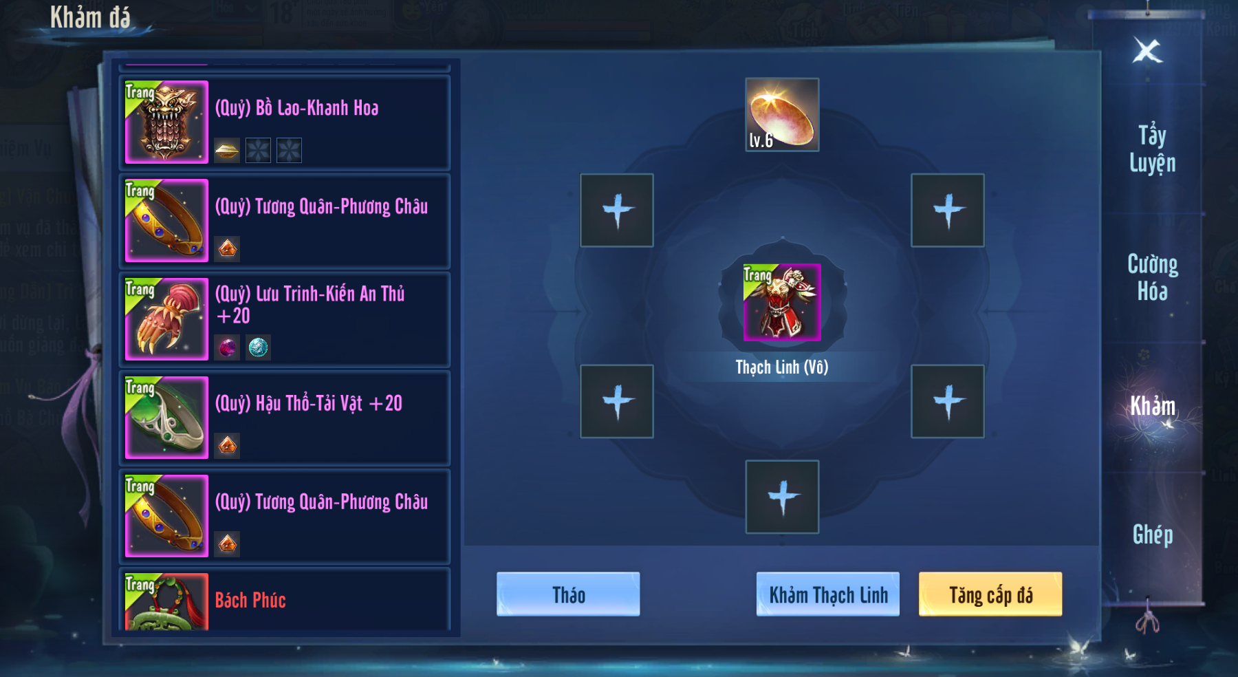 - Khi khảm đá quý theo một tổ hợp nhất định vào loại trang bị đặc thù, sẽ kích hoạt hiệu quả Thạch Linh, giúp nhận thêm thuộc tính phụ. Việc khảm không yêu cầu thứ tự, nhưng bắt buộc đúng loại trang bị.