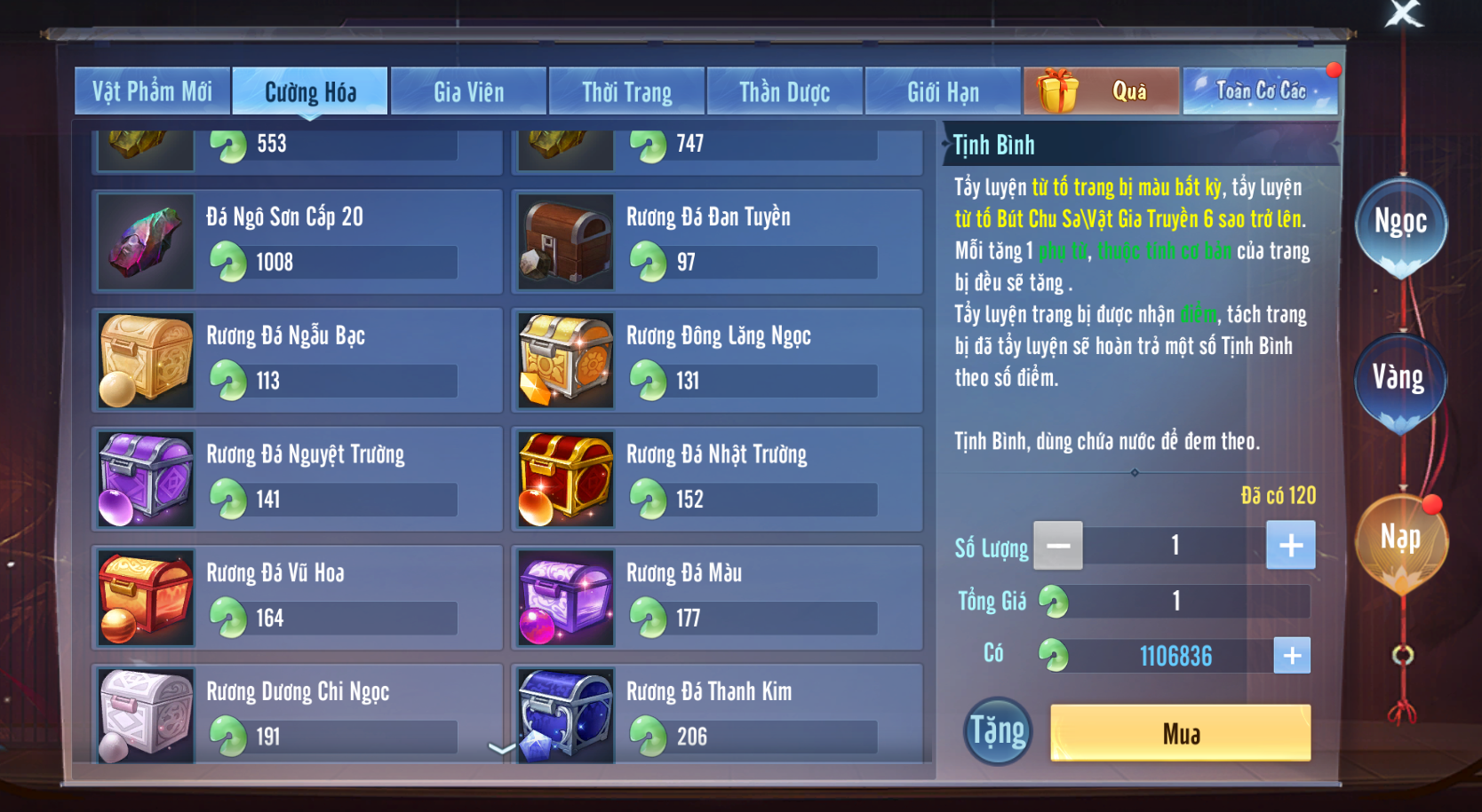 - Đổi bằng Điểm Quan Ninh (sau khi mở phong ấn Phi Thăng)