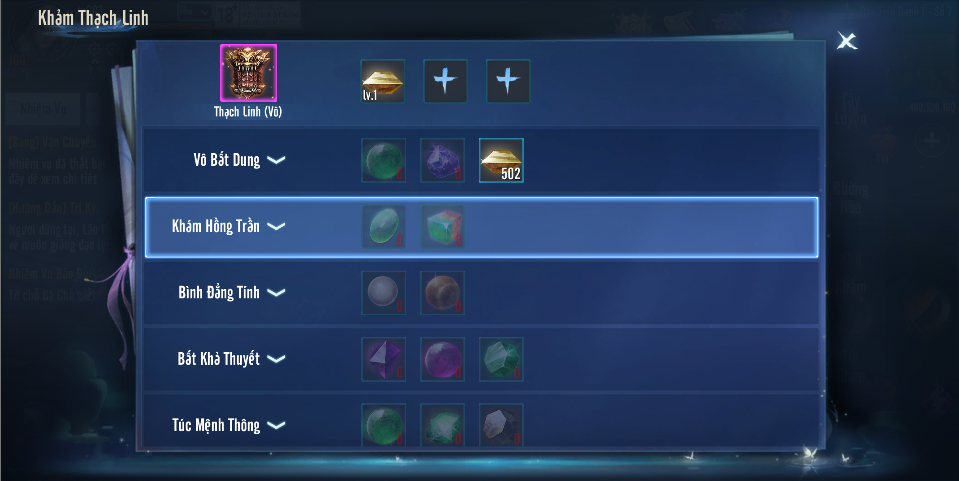 - Ví dụ: Bộ Thạch Linh Khám Hồng Trần chỉ phát huy tác dụng khi được khảm trên khiên, hộ thủ (hộ uyển) hoặc lăng có ít nhất 2 lỗ; nếu khảm vào loại trang bị khác sẽ không có tác dụng.