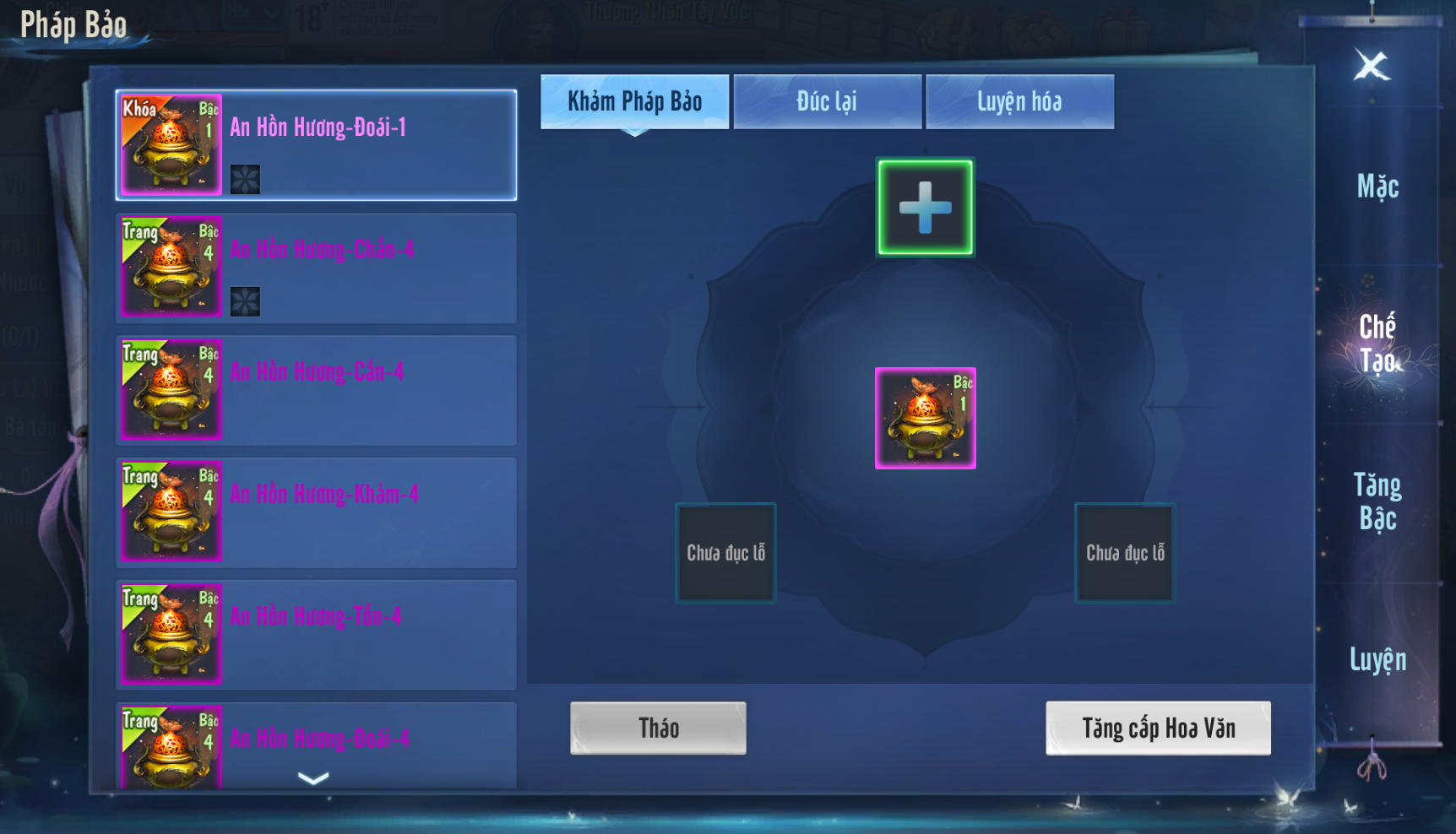 - Nâng bậc Pháp Bảo Tiên Gia: Khi Pháp Bảo Tiên Gia tiến hành nâng phẩm bậc, Hoa Văn trong Pháp Bảo không cần tháo ra mà vẫn có thể thao tác trực tiếp. Sau khi hoàn tất, Hoa Văn vẫn nằm trong Pháp Bảo mới và số lượng lỗ không thay đổi.