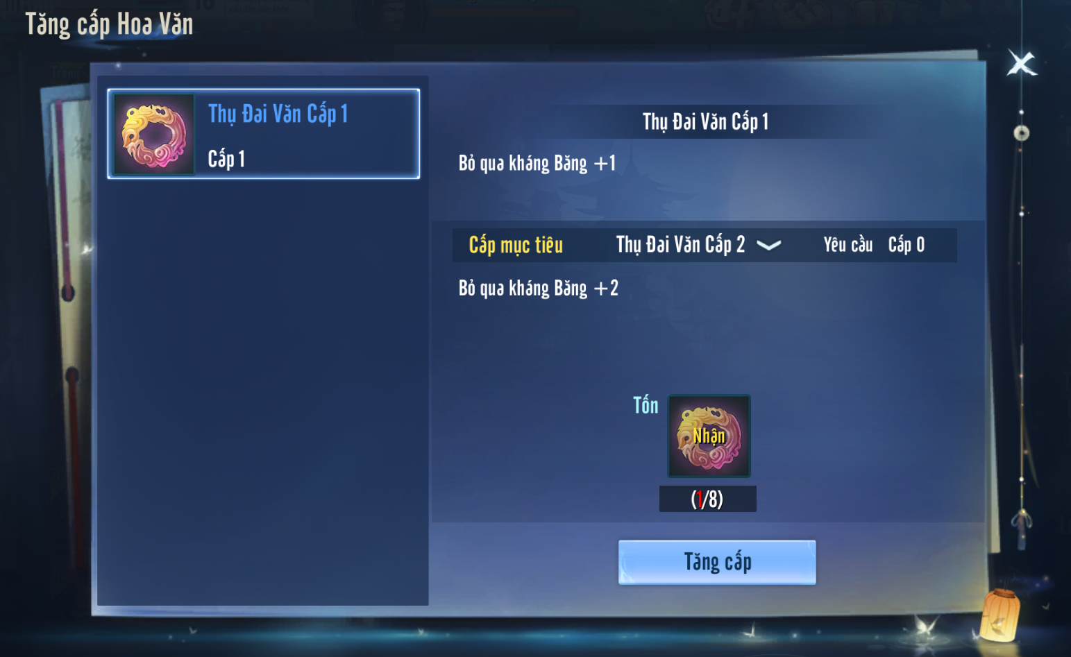 - Người chơi chưa Phi Thăng thì Hoa Văn liên quan chỉ có thể nâng tối đa đến cấp 2.