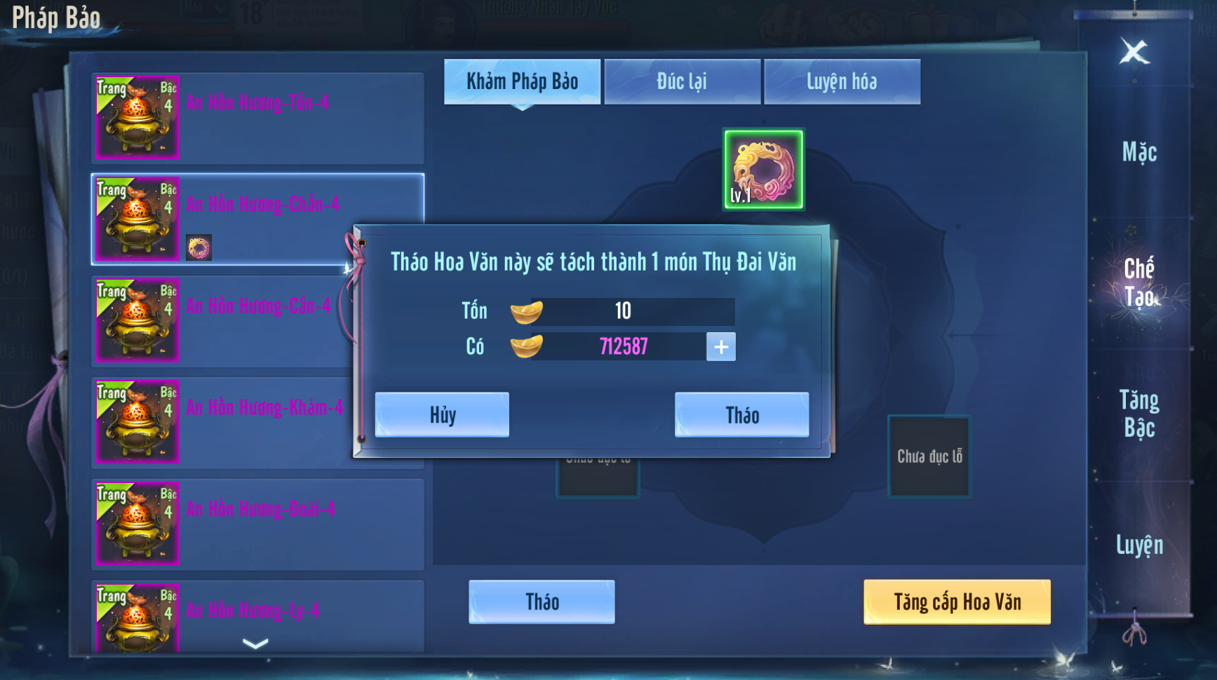- Khi tháo Hoa Văn cấp cao, sẽ hoàn trả lại toàn bộ nguyên liệu đã tiêu hao trước đó, tức là hạ cấp thành nhiều Hoa Văn cùng tên cấp 1 và đá quý tương ứng.